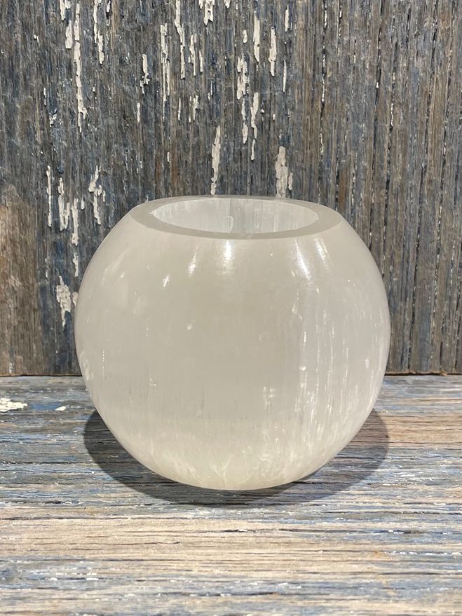 Selenite is named for the Greek goddess of the moon Selene for its moonlike glow. When the candle is lit, a warm, pure glow emanates from within the vessel. Selenite is thought to be the sage of the mineral world, purifying and cleansing your space and bringing about harmony and balance by clearing away negative energies. Perfect to use during meditation, to cleanse crystals and for setting intentions. Mined carved and polished in Morocco. Tea light candle included. Approx. 2.5" high x 3.25 diameter.